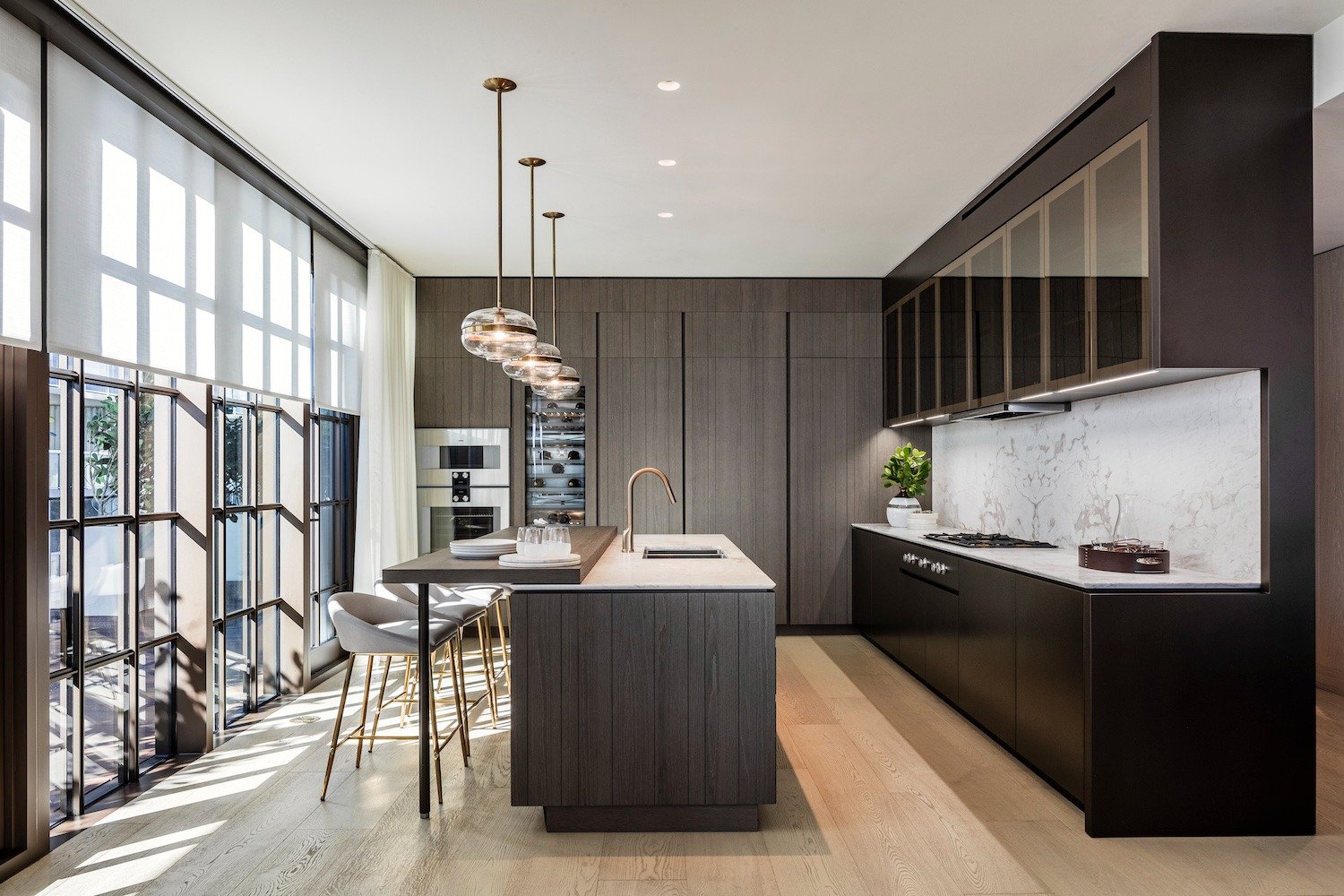 - Custom Poliform cenere oak cabinetry with brushed bronze lacquer and glass detailing