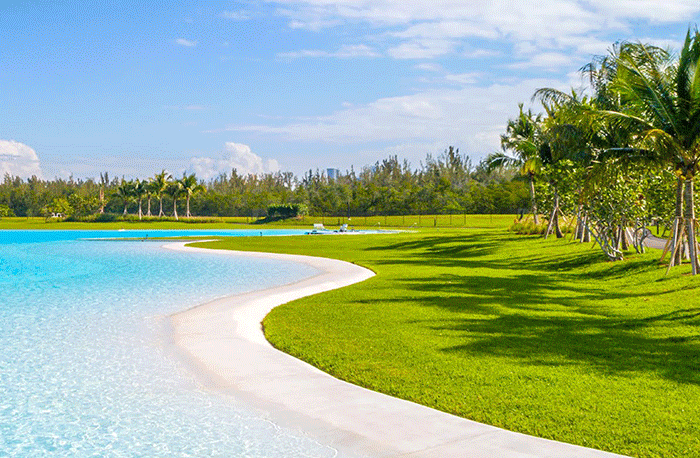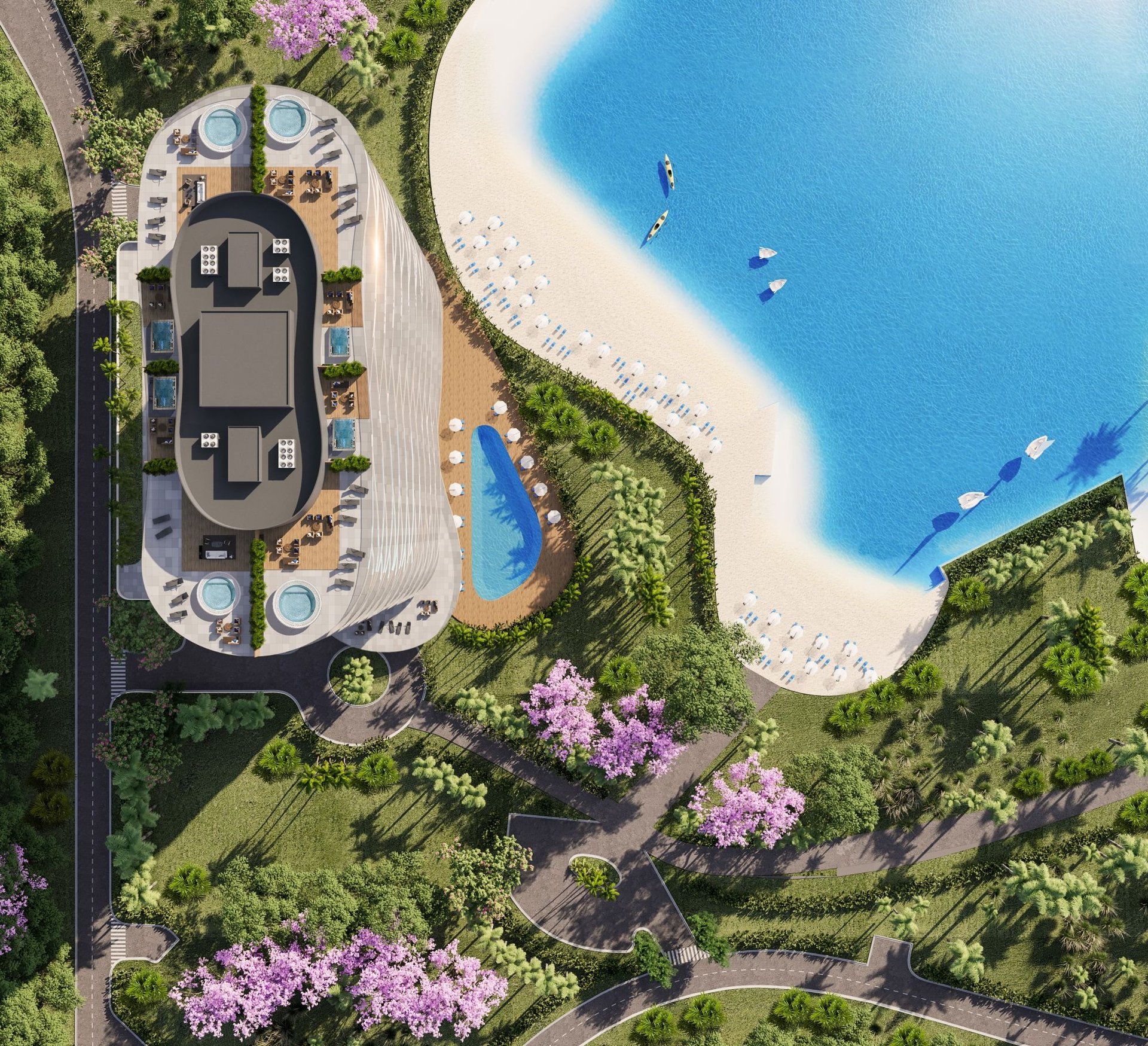 Poolside summer kitchen Children’s play zone Dog-walking trails ONE Jardin and lushly landscaped pathways leading to ONE Beach Club, playgrounds with professional tennis and pickleball courts ONE Beach Club with sandy beaches, seven-acre Crystal Lagoon™, beach cabanas, picnic spots, kayaking, paddle boarding, paddle boats, water mats, inflatables, snorkeling, and concierge-style snack, towel, and beverage service